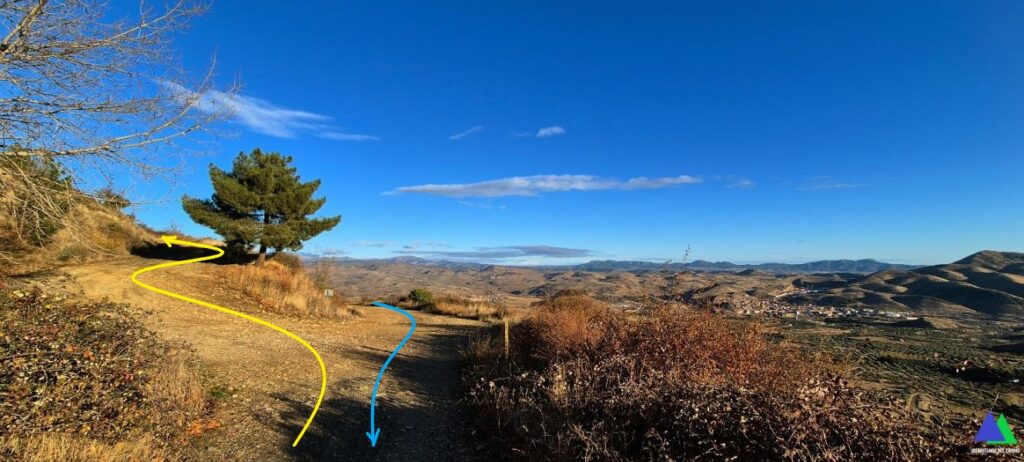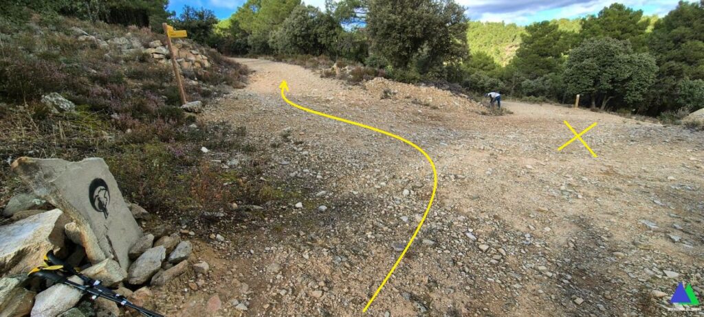 Cien metros más abajo, entre algunos ejemplares de alcornoques, llegamos a un cruce donde por el PR continúa por la izquierda –opción que recomendamos porque se llega de forma más rápida al punto del cortafuegos al que llegaremos más tarde nosotros. Continuamos de frente, siguiendo el track, hasta que el sendero desemboca en una pista donde discurre la ruta del Papa Luna en una bifurcación de caminos.