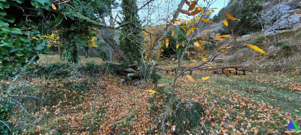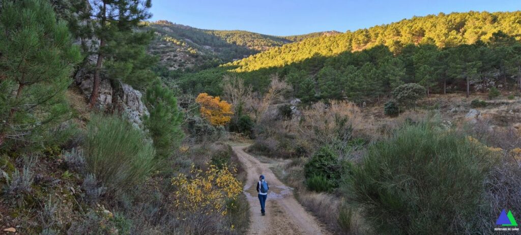 Aparcamos muy cerca de un cruce de caminos (0 km, 848 m), donde 300 metros después de terminar el vial asfaltado, hemos seguido por una pista de tierra. Desde el mismo cruce comenzamos esta sencilla ruta circular en sentido contrario a las agujas del reloj, siguiendo el amplio camino (pista) que discurre en dirección noroeste por el linde del pinar hasta llegar al área recreativa de la fuente de Valdejuen (1,3 km, 901 m).