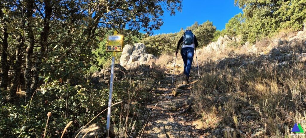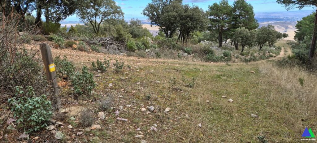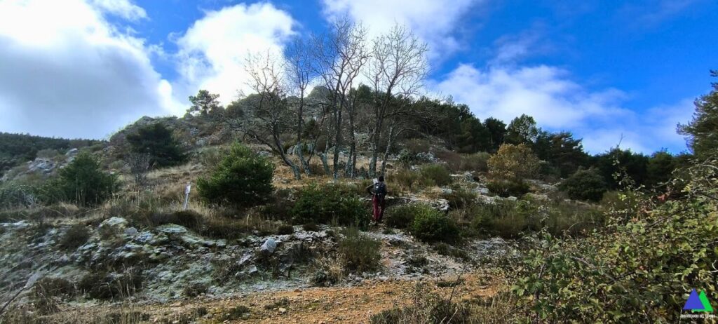Desde aquí iniciamos un breve descenso entre abundantes jaras, hacia la visible peña Guzmán. Pronto llegamos a la base de la Peña, (6,2 km, 1356 m) donde el camino continúa en dirección a la localidad de Viver de la Sierra. Nosotros lo abandonamos tomando un sendero desde el que subiremos a la Peña.
