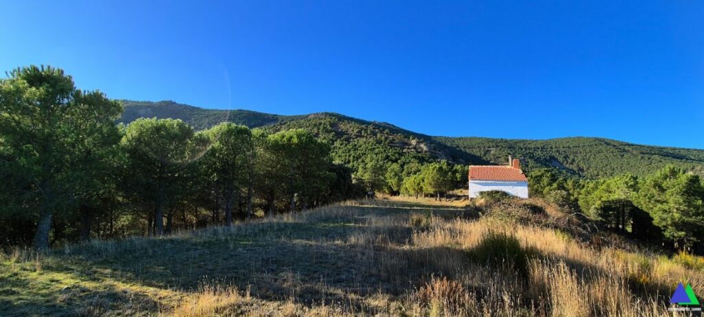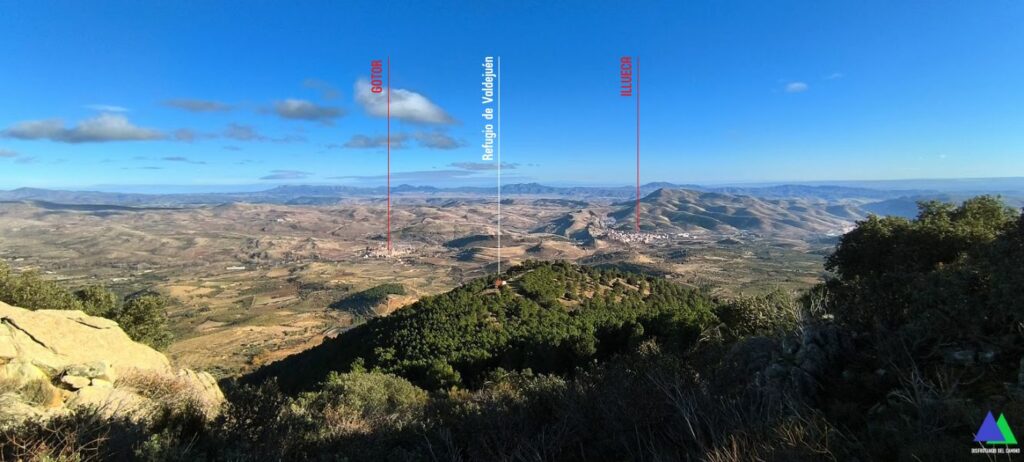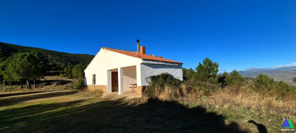 Entre encinas y pinos, el sendero nos lleva a un promontorio donde se encuentra el refugio de Valdejuén (2,2 km, 1015 m), de blancas paredes y tejado rojo en el que sobresale la chimenea para el fogón que hay en su interior además de unas mesas de madera. Refugio de uso libre que en algunos mapas aparece referenciado como «corral de Valdelajuén«. Muy cerca de él, han colocado una mesa interpretativa de la zona, donde se pueden observar los núcleos urbanos de la comarca.