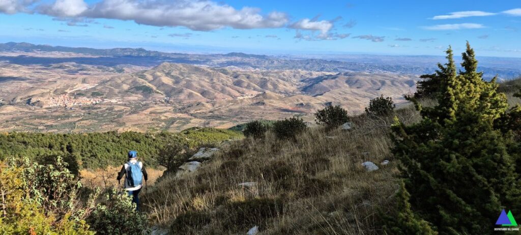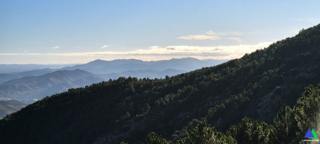En la zona de El Picuezo, hacemos una breve pausa en un mirador (8,2 km, 961 m), donde contemplamos en la ladera norte del barranco de las Umbrías, el alcornocal de Sestrica y desde el que vemos la Peña Guzmán. Antes desde otro mirador natural que hemos identificado en Wikiloc, contemplamos similares panorámicas.