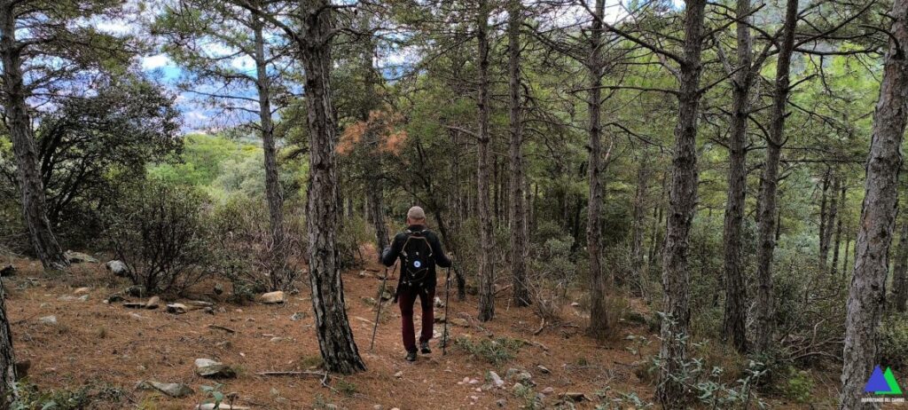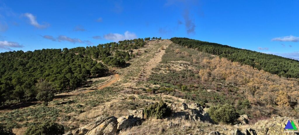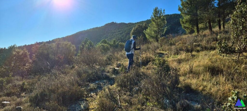 Subiendo por el lomo del monte entre una densa y variada población vegetal y algunos claros abiertos, la senda cruza en dos ocasiones la pista forestal que atraviesa la sierra y sigue de forma directa y en constante subida hacia la cima.