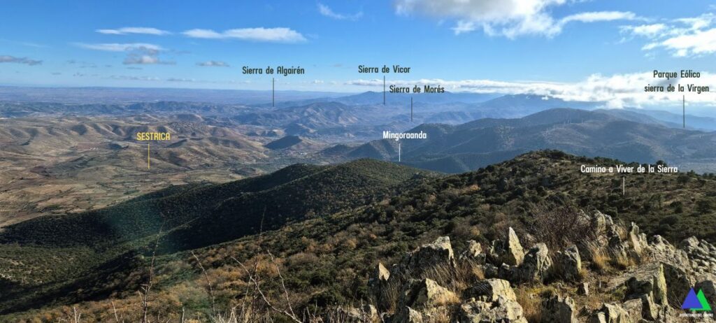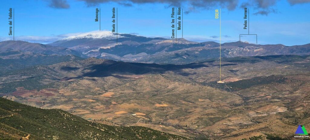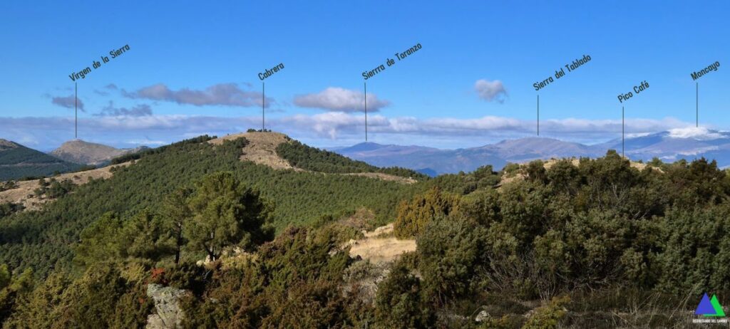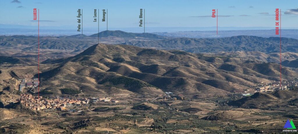 Nuestra excursión recorre gran parte de esta sierra por pistas y senderos balizados, coincidente en muchos tramos con la “Ruta Papa Luna” donde en el cordal cimero se alzan el pico Cabrera, 1433 m, vértice de la sierra, Pico Café, 1401, Peña del Café, 1412 m y Peña Guzmán, 1412 m, sobre las localidades de Illueca, Brea de Aragón, Sestrica, Viver y Aniñón,.. situadas todas ellas en el piedemonte de la sierra. En su parte alta, se localizan los restos de antiguos neveros y buenas vistas desde las cimas de toda la comarca.