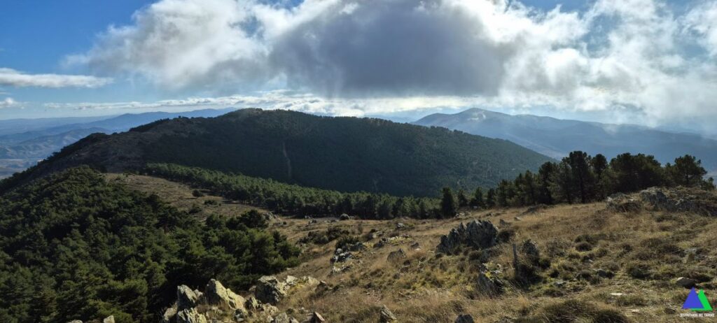 11:38 Sobre verdes pinares de repoblación y con unas nubes preciosas descendemos hacia el pico Café