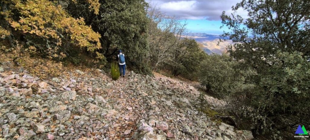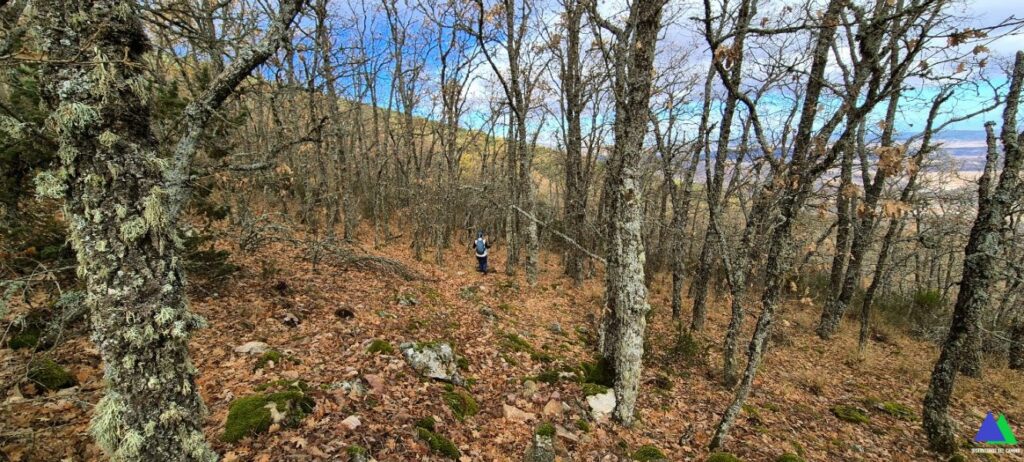 Bajamos de nuevo al sendero desde el que hemos subido a la cumbre, e iniciamos el descenso por una antigua senda, sin señalizar, pero muy marcada. La fuerte pendiente, la humedad del terreno y una buena rosada, provocan que saquemos los bastones de la mochila por seguridad. La senda va perdiendo desnivel y tras pasar por un robledal desnudo de hojas y durante un buen tramo por una pedrera, los robles dan paso a carrascas y pinos y desemboca en un cortafuegos (6,9 km, 1194 m), en la que la pista da una gran revuelta ascendiendo hacia el pico Cabrera (“PR-Z 73 Ruta de Papa Luna”).