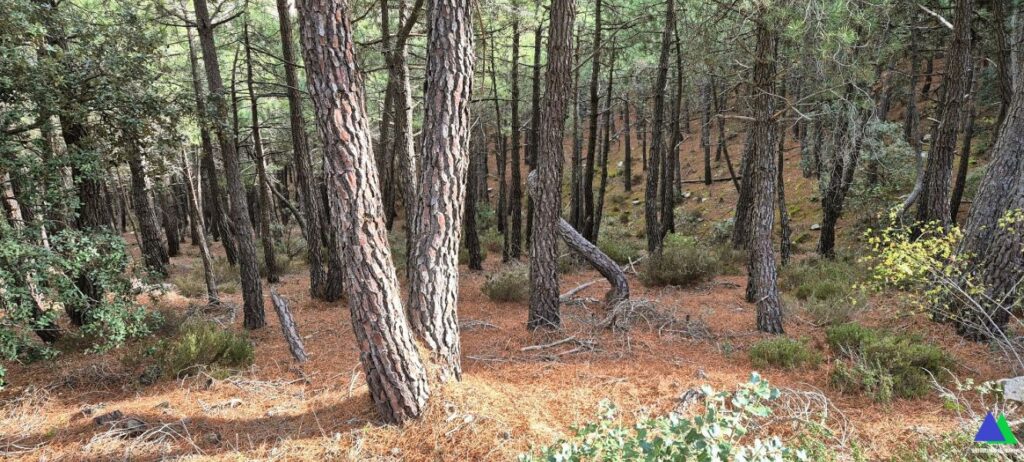 No sigáis por la derecha, nos equivocamos. Retrocedimos para continuar por la izquierda por la pista siguiendo las marcas de la ruta del Papa Luna que discurre por el pinar en dirección noroeste, hasta el punto de partida. Antes, la pista cruza el cortafuegos donde abandonamos definitivamente la ruta balizada.
