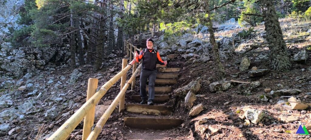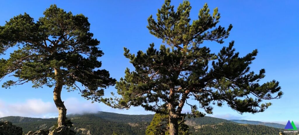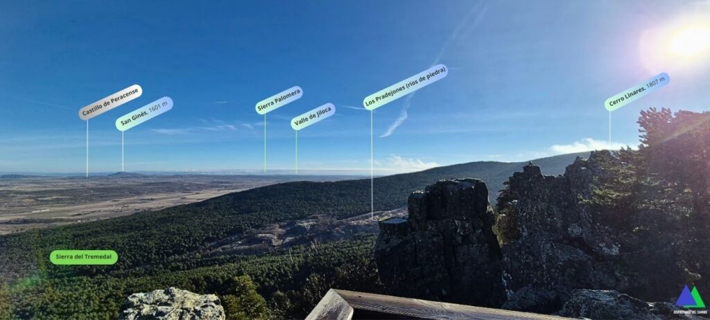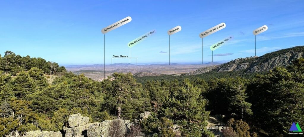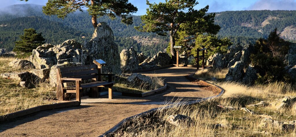 Después de recorrer los alrededores del santuario, visitando los miradores naturales que nos ofrecen las cuarcitas, salimos por el Camino de los Griegos (3 km, 1769m), por donde discurre el GR-10.1 y el SL-TE 43, que nos llevara entre un frondoso bosque de pino albar hacia el mirador de los Griegos. En esta zona seguimos viendo las características formaciones de “ríos de piedra” de esta sierra.
