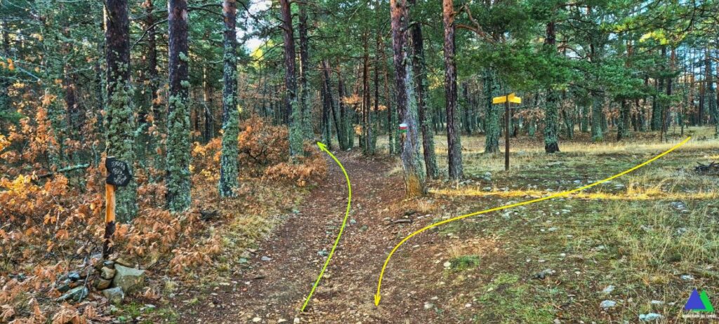 A la izquierda de la residencia, una tabla de madera clavada en un árbol, nos indica el nacimiento de una trocha hacia el “Santuario” y a la “Fuente Colladillos” por la que en solo trescientos metros alcanzamos la senda que sigue los pasos de la romería a la Virgen del Tremedal (0,3 km, 1562 m), y por la que discurre el GR-10.1 y el SL-TE 43 que vienen de Orihuela pasando por la Ermita de Santa Bárbara. Seguimos por la izquierda atendiendo las marcas blancas, verdes y rojas, llegando 500 metros después al primer cruce señalizado (inicio y fin de la circular) donde el sendero de la derecha se dirige a la “Majada de las Vacas” y a los “Colladillos”.