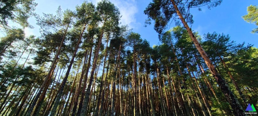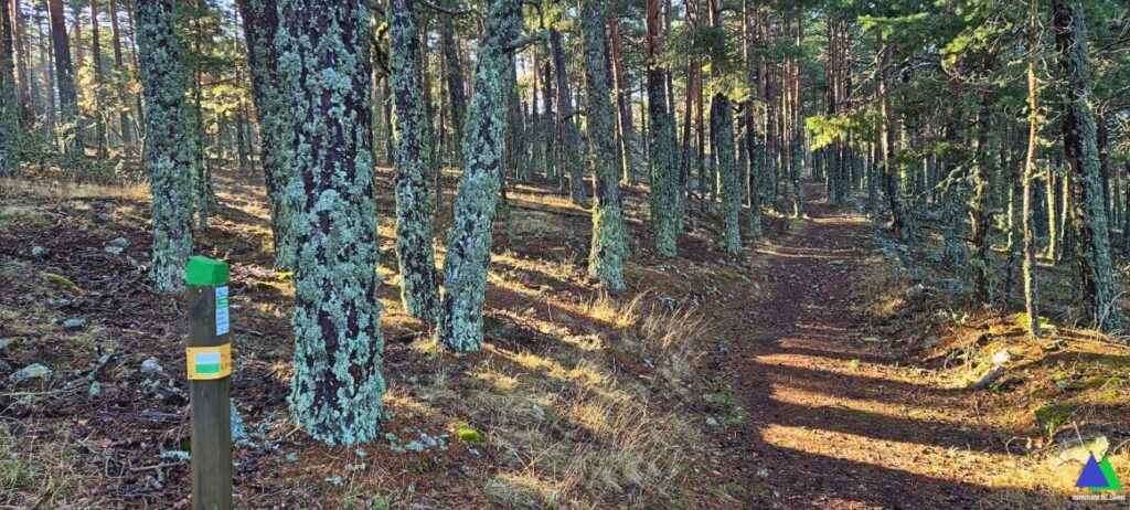 Junto a un abrevadero reanudamos el camino por el sendero local que enlaza esta majada con la fuente de los Colladillos. Un bello tramo por el denso bosque de pino albar.