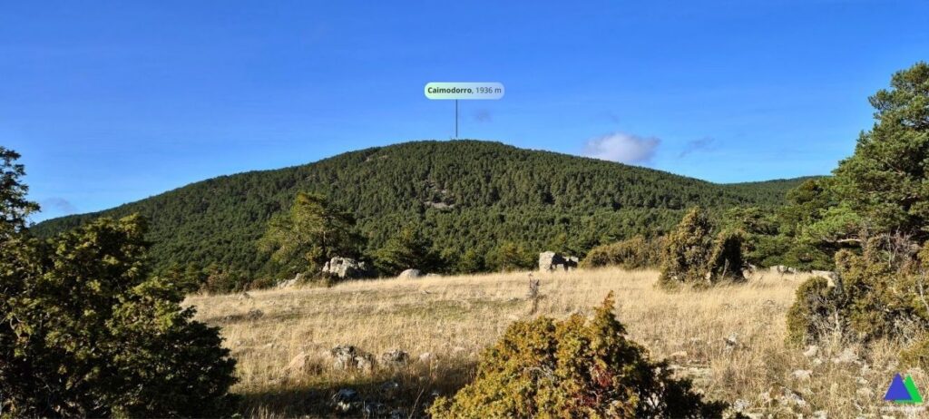 Desde el desvío la senda asciende con fuerte inclinación. Poco a poco y tomando algún respiro la salvamos, superando unos 130 metros de desnivel hasta alcanzar la cima del Caimodorro (8,3 km, 196 m), pico más alto de los Montes Universales y donde encontramos el vértice geodésico rodeado de pinos que no dejan ver el horizonte y una torre metálica de 13 metros de altura, que hace de mirador. Subimos a la plataforma superior donde obtenemos unas magníficas vistas de la sierra.