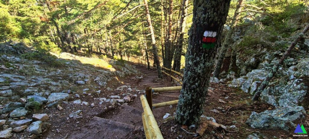 Desde este lugar, sale una senda que desciende hasta la Majada de las Vacas por un bosque mixto de pino albar y rebollos. En la mitad de este trayecto, alcanzamos una zona rocosa de fuerte pendiente donde se han instalado unas escaleras con peldaños de madera que nos facilitan el descenso.