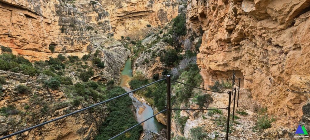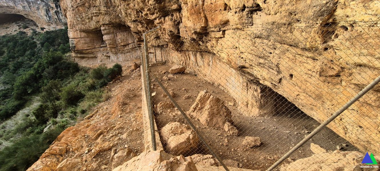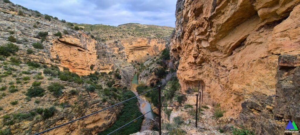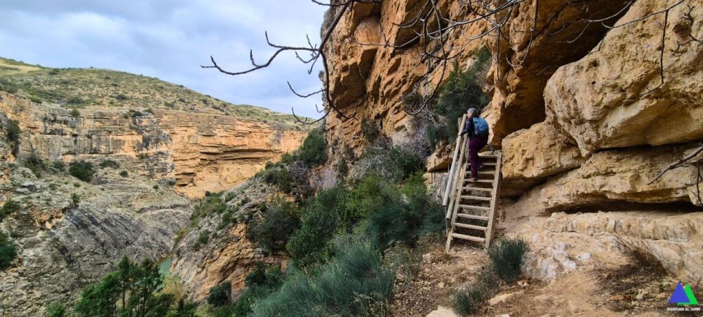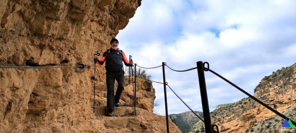 Nos adentramos en el tramo más escabroso entorno al río y más espectacular de la ruta. La senda se cuelga literalmente sobre los Estrechos del Martín, en la que se han habilitado tramos de escaleras con barandillas y sirgas de apoyo. Poco a poco, el sendero es cada vez más aéreo que nos ofrece vistas muy escénicas y emocionantes.