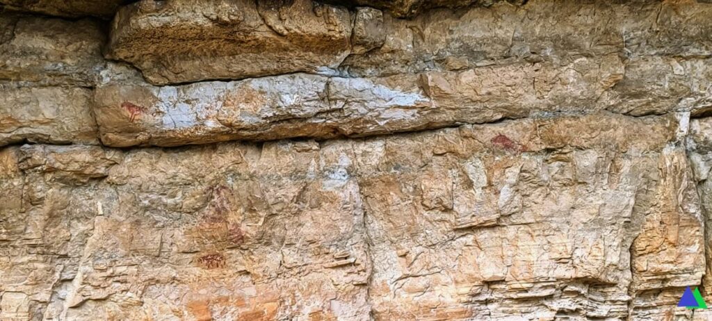 Después de visitar el Abrigo de los Chaparros I, seguimos dando la vuelta hasta el final del recodo donde giramos a la izquierda bajo un gran farallón rocoso y llegar de esta forma al Abrigo de los Chaparros (sin apellidos), donde aquí, sí observamos figuras humanas y representaciones de animales.