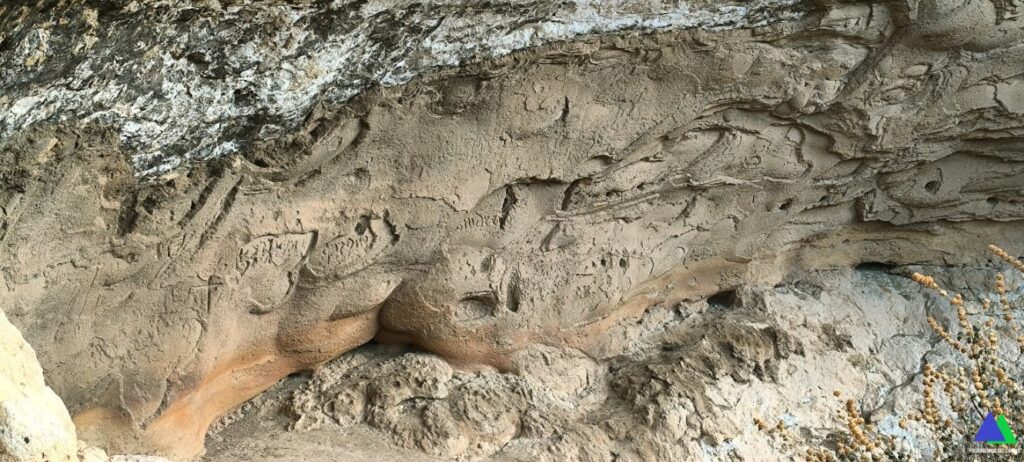 Llegamos al abrigo rupestre conocido como Cueva de los Grabados (0,9 km, 431 m), una de las ofertas de arte rupestre a lo largo del río donde podemos ver numerosas cruces procesionales de origen medieval.