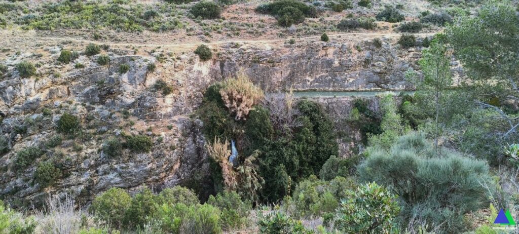 Tras pasar brevemente junto al río. la senda sube casi «colgada», entre gamones, lentiscos, jarillas y sobre todo ente romeros y sabinas negras. Al otro lado del río vemos pequeños olivares abandonados, la acequia de la Central de Rivera y la senda por la que volveremos.