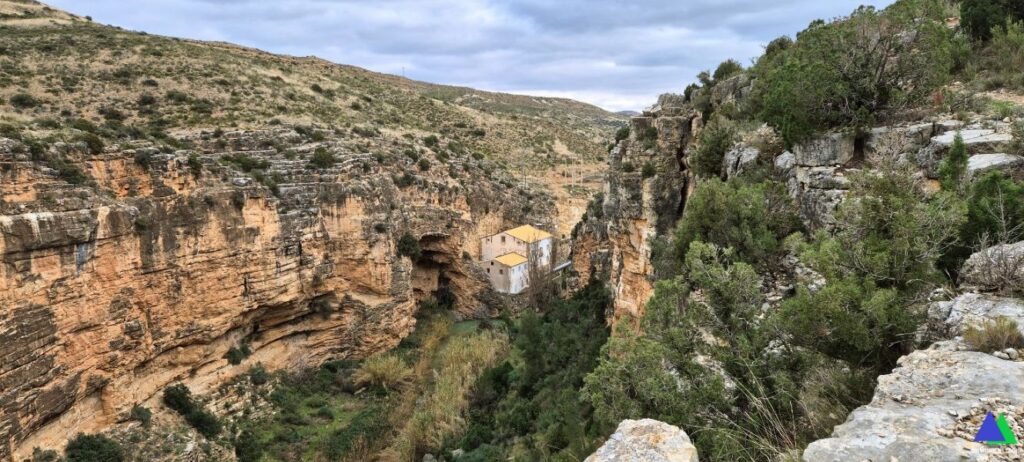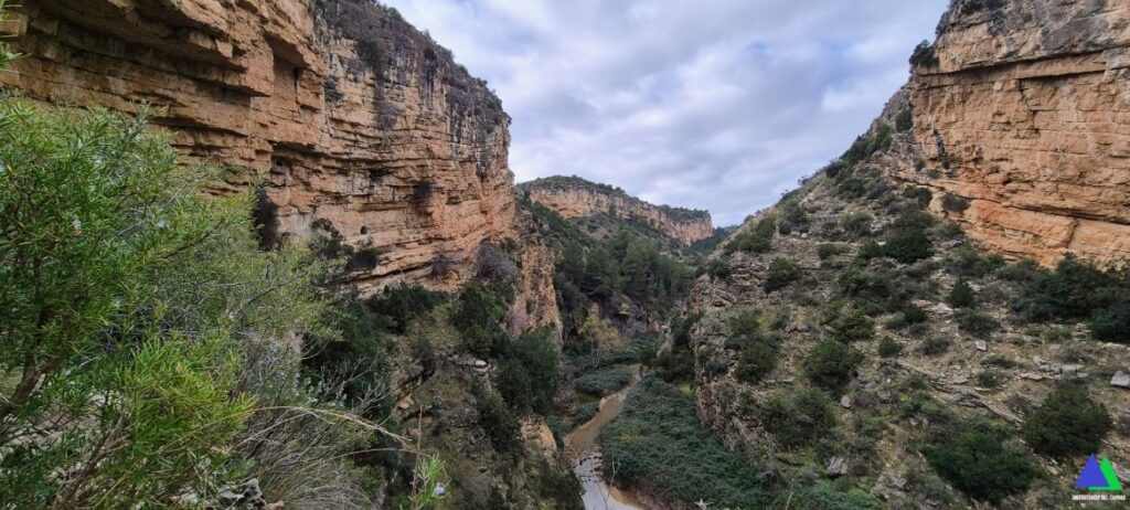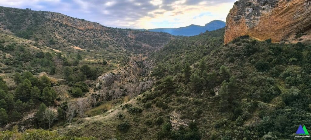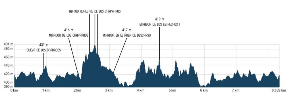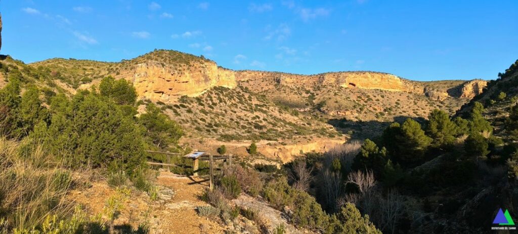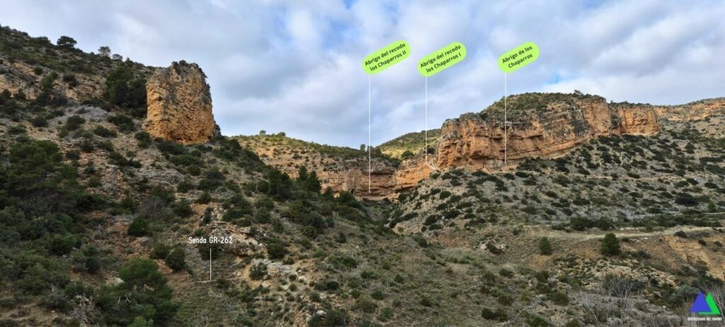 En la otra orilla vemos el camino de ida. Cuando llevamos 6,5 km, llegamos al mirador del recodo de los Chaparros, también con mesa interpretativa del arte rupestre levantino y esquemático y desde donde observamos los Abrigos del recodo de los Chaparros I y II y el Abrigo de los Chaparros.