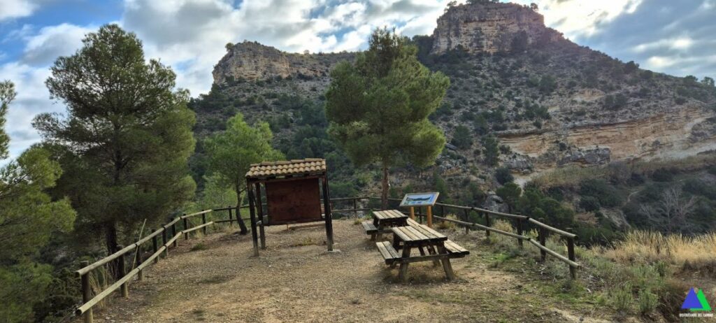 Dejando atrás este abrigo prehistórico, seguimos la ruta hasta una pequeña área de descanso (3,2 km, 417 m), con bancos, caseta y mesa interpretativa del paisaje del entorno.