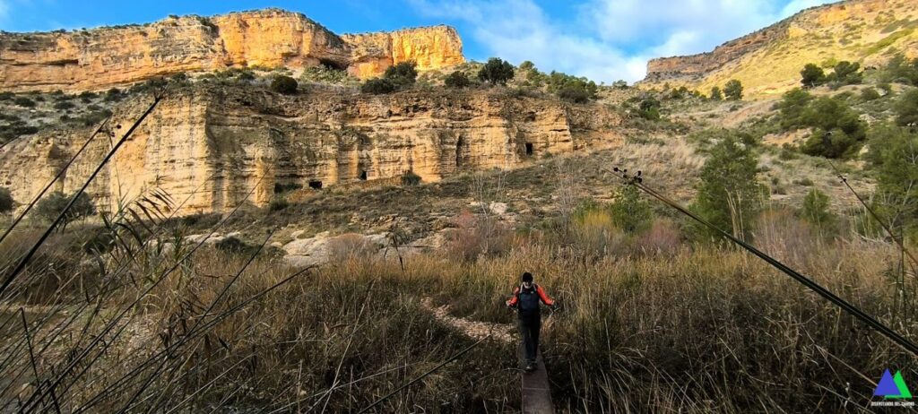 Terminada la gran curva que forma el río llegamos hasta una pequeña explanada, donde vemos al otro lado la Cueva de los Grabados; en este punto los postes nos indican que debemos bajar al río y, atravesando un pequeño pinar, cruzar de nuevo el río por una estrecha pasarela metálica. De este modo nos incorporamos a la senda por la que habíamos iniciado la ruta, regresando hasta el Puente del Batán.