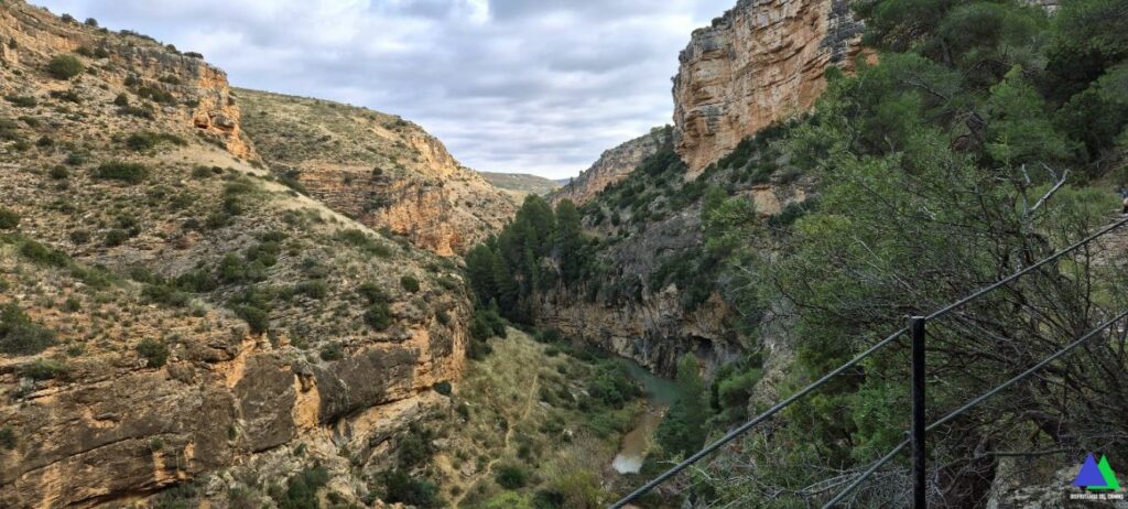 Finalmente llegamos a este magnífico mirador (4,8 km, 417 m), donde hay una mesa interpretativa que explica el desarrollo de las pinturas localizadas en el entorno y con vistas del angosto desfiladero por donde discurre el río Martín y desde donde observamos, en la pared rocosa de enfrente, el abrigo utilizado por los humanos prehistóricos para realizar sus pinturas. Enfrente vemos el mirador de Los Estrechos de la margen izquierda del río. Río abajo, la Central de Rivera.