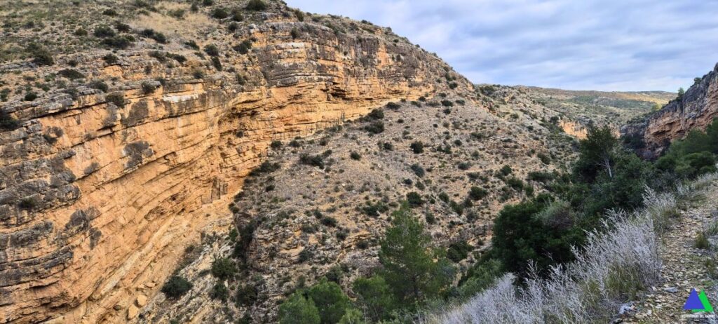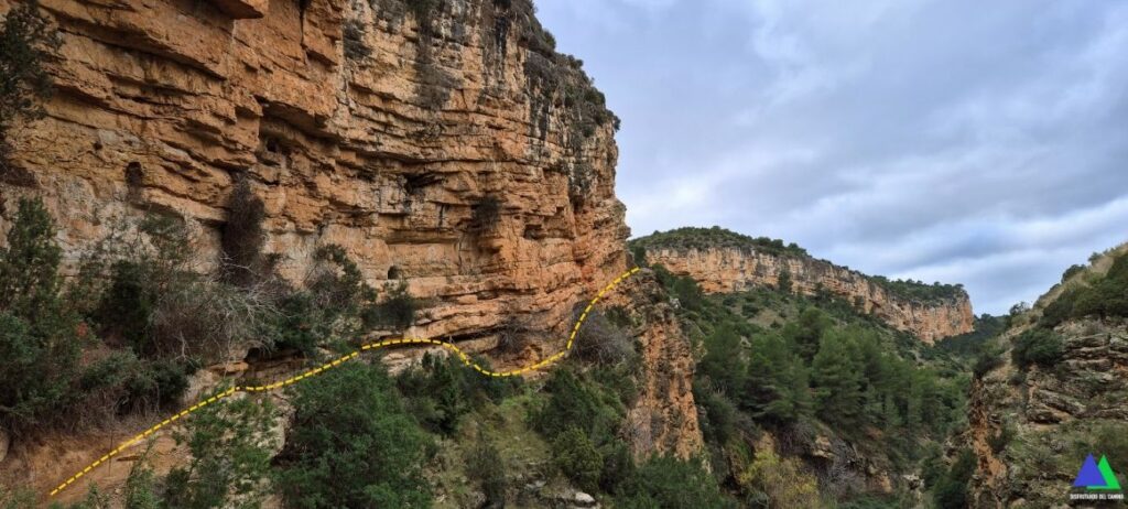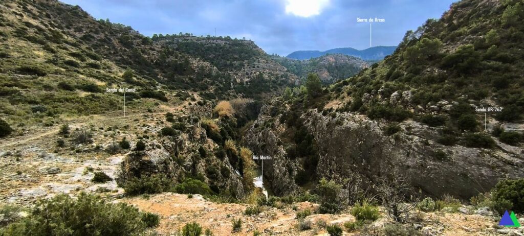 La senda que trascurre aferrada a un gran cortado de la roca, remonta una empinada ladera llegando a un cruce señalizado, con vistas, a la Central de Rivera y donde la senda del GR-262, desciende hacia el río Martín y continúa, hacia “Los Estrechos I / Albalate del Arzobispo” y “Los Estrechos II / Ariño”, opción que hubiéramos realizado, si el caudal de río nos lo hubiera permitido. Nosotros seguimos por la senda, al cercano mirador de los Estrechos I, situado en la cima del cerro.