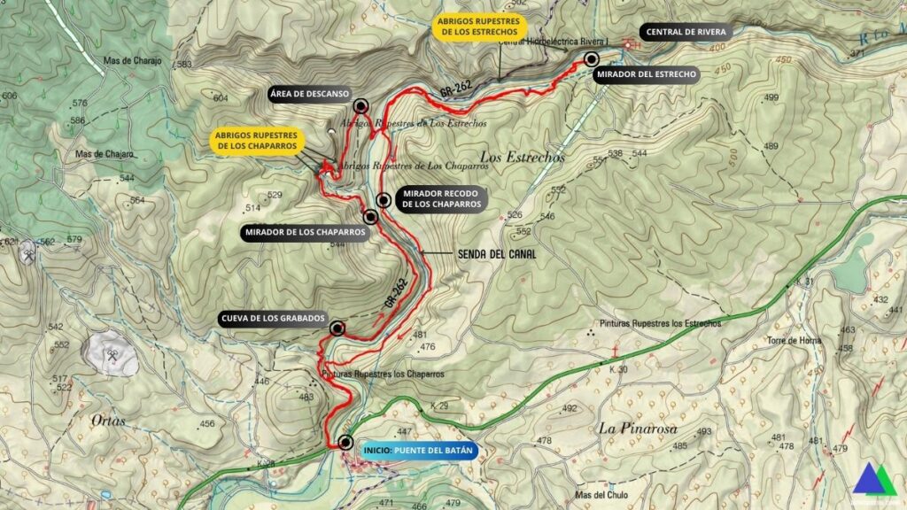 Al tramo del sendero GR 262 que va desde el Puente del Batán hasta la central de Rivera se conoce como Ruta de los Estrechos, pues recorre uno de los tramos más espectaculares del curso del río Martín, encajado entre elevados cantiles y farallones rocosos. Este espacio alberga importantes conjuntos de pinturas rupestres, declarados Patrimonio Mundial por la UNESCO.
