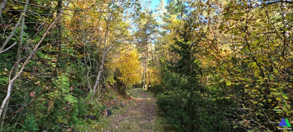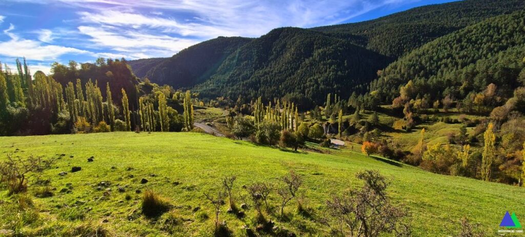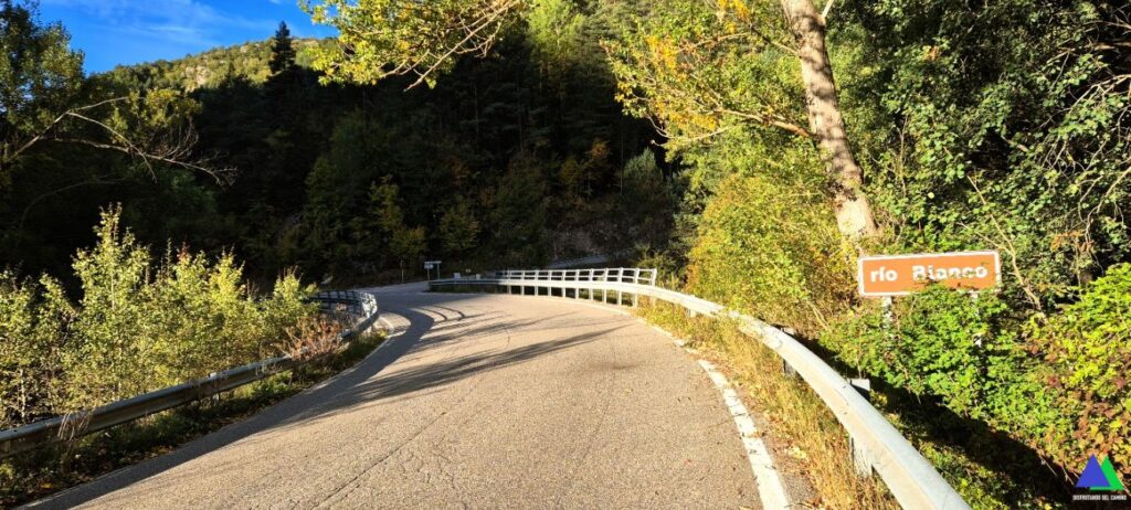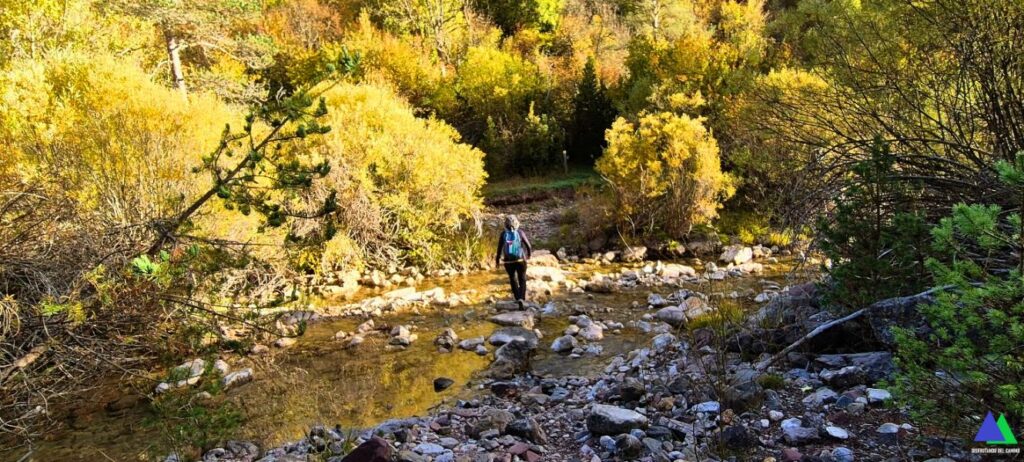 El camino balizado y adornado de colores otoñales, tras unos quinientos metros, se desvía a la derecha, vadea el cauce del río Blanco o de Espés (1,2 km, 1.165 m), y continúa aguas arriba en suave ascenso. Pronto entramos en un precioso bosque donde encontramos un cruce señalizado (1,8 km, 1244 m). Aquí abandonamos el GR-17 que se dirige por la derecha hacia Alins y que nosotros seguiremos a la vuelta de la circular. Es en este punto también, donde nuestro sendero del GR 18.1, enlaza con el GR 15 que discurre entre Pont de Suert y San Feliú de Veri y que seguiremos hasta la localidad de Abella.