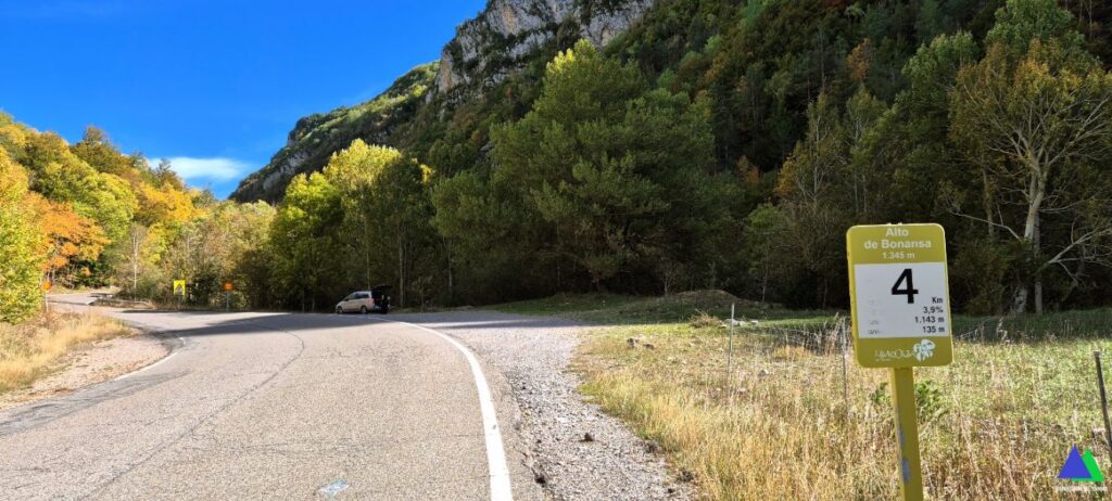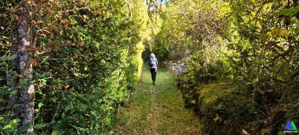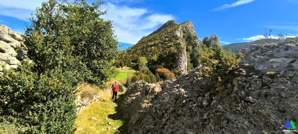 Descendemos hacia la derecha para realizar tres cortas revueltas. A la tercera, tenemos que abandonar el camino balizado del GR-15 y 17, para tomar un sendero oculto por los matorrales, que arranca por la derecha. ¡OJO!, prestar atención al track, porque nosotros aquí, proseguimos unos metros y tuvimos que volver. Seguimos descendiendo pegados a la roca y por encima de unos bancales de pasto hasta que finalmente nos internamos en un quejigar. Al final del mismo se encuentra el puente del río Blanco, comienzo del puerto de Bonansa.