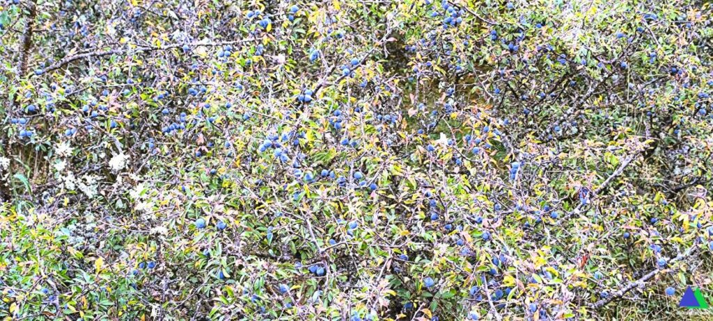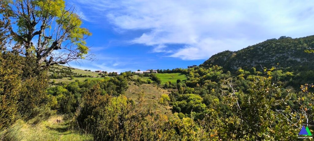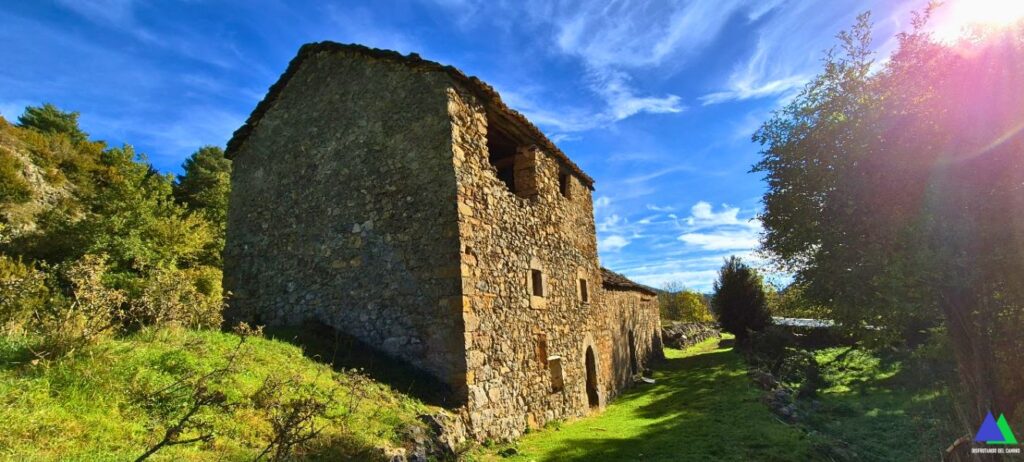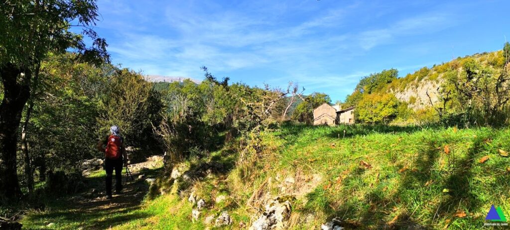 Una vez atravesado, el camino realiza una corta subida y antes de llegar a un extenso prado donde se presenta ante nosotros el macizo del Turbón, nuestro objetivo de mañana, pasa por una zona de espinosos arbustos “Prunos Spinosa”, donde nos dan ganas de parar a recoger unas hermosas “endrinas” o arañones que seguro nos darían un excelente pacharán. Pero tenemos que continuar. Tras atravesar un pequeño arroyo, el camino continúa entre bojes y muros de piedra hasta que llega a una construcción agropecuaria, situada metros antes de la ermita de la Piedad, del siglo XVI.