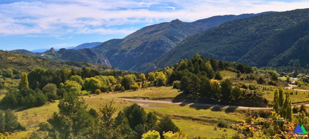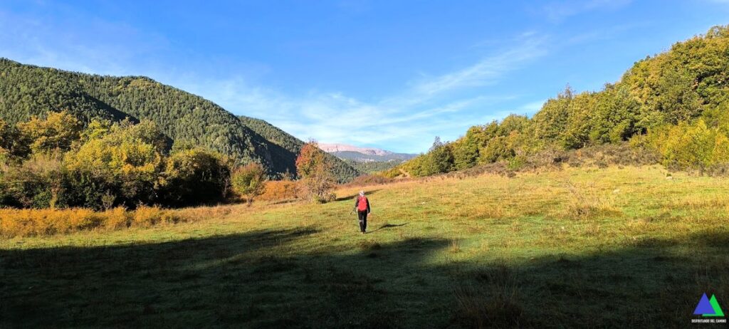 09:58 Prados y bosques articulan el paisaje por el que pasamos. Al fondo, el macizo del Turbón