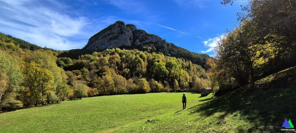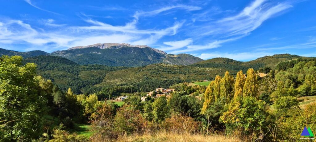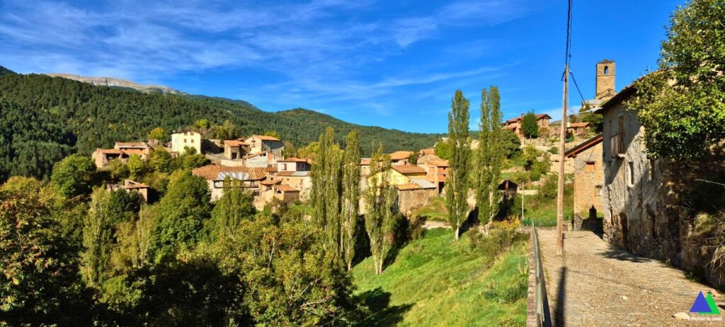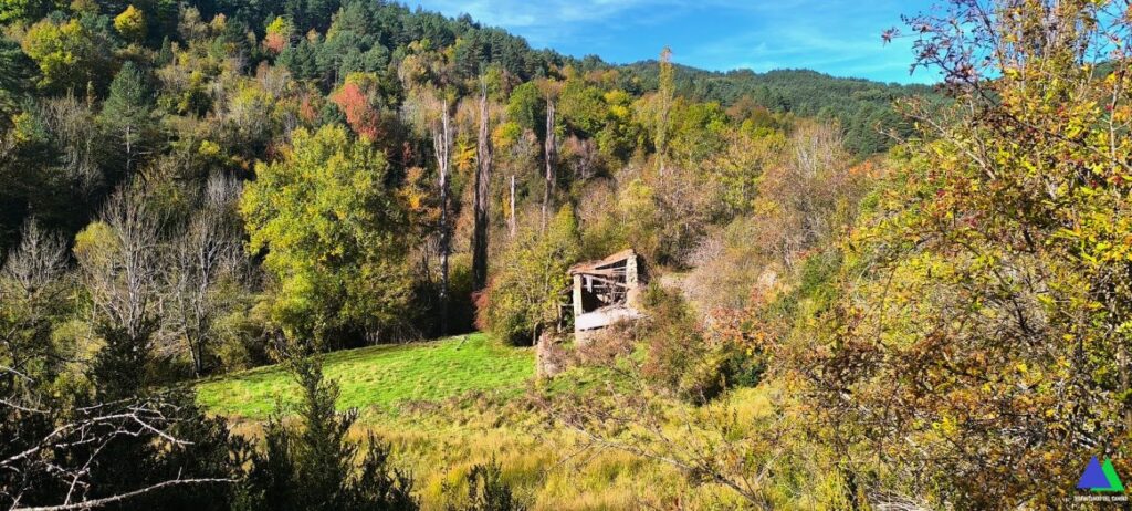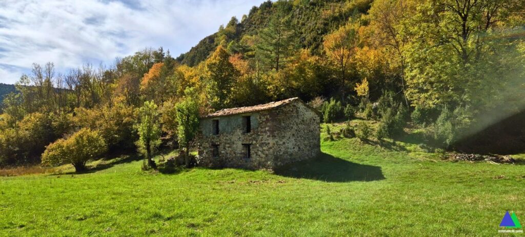 Atravesamos la única calle de este pequeño pueblo donde destaca la iglesia de San Vicente del siglo XVI. Al final de la misma, arranca una pista por la que continuamos en dirección norte. Más adelante, un camino de herradura desciende en fuerte pendiente y en diagonal por el hayedo hasta el plano de la borda de Roca, 1240 m. Antes, en la bajada, existe un desvío que permite acercarse a visitar la fuente Salada. Así pues, llegamos a este precioso rincón donde se unen el barranco Salat con el de la Paúl y donde a la derecha, se encuentra la solitaria edificación adornada de un bello paisaje otoñal.