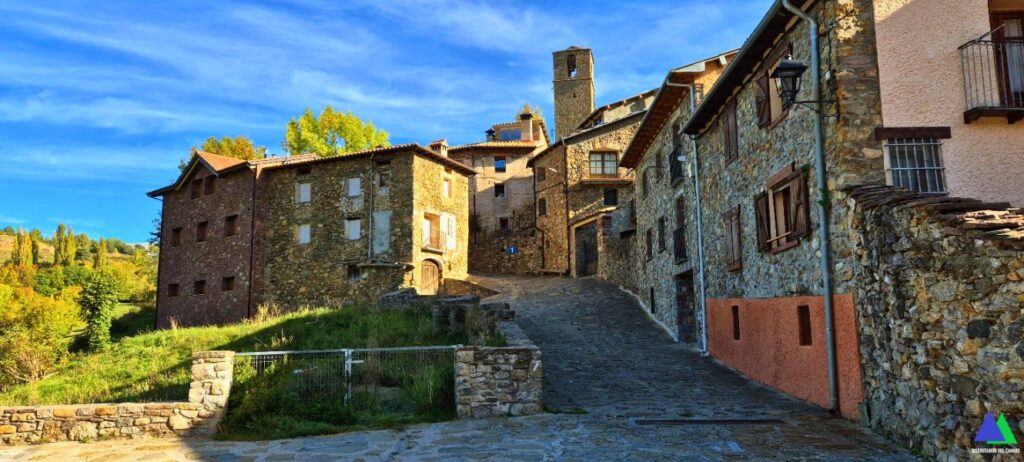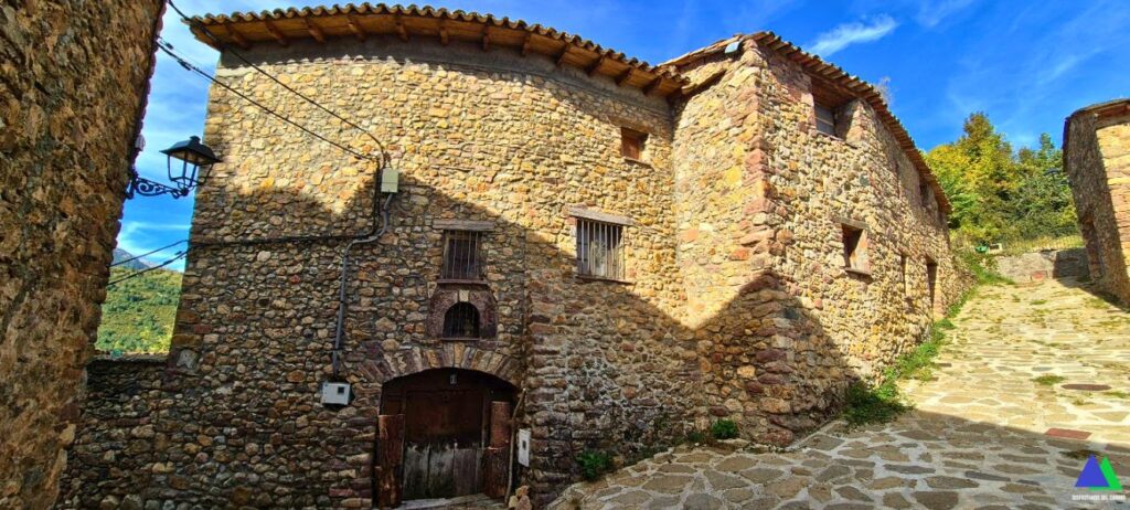 Finalmente entramos en la localidad de Alins de Isábena (16,6 km, 1395 m), donde a la izquierda se sitúa la iglesia de San Pedro del siglo XVI. En la pared de una casa junto a ella, una señal nos marca la dirección del GR-15 y 17, que continúan hacia Bonansa. Pasamos junto a la portada de la iglesia, llegamos a casa Español, mansión noble que conserva un escudo de armas y parte del recinto amurallado. El camino va girando a la derecha entre grandes bojes y luego realiza una curva a la izquierda para adentrarse entre curiosas paredes de piedra en el valle del Isábena.