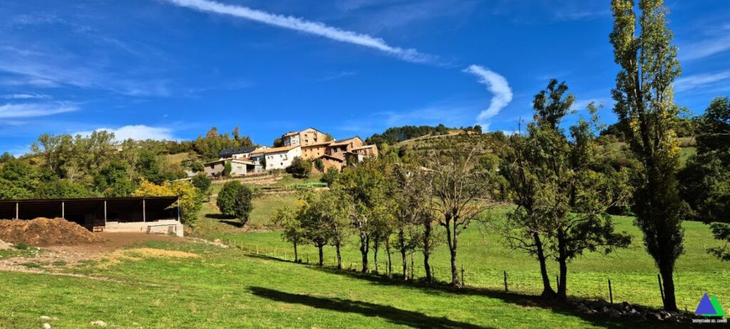 Tras pasar junto a una nave ganadera llegamos a un cruce bajo la localidad (7,4 km, 1373 m), donde nace a la izquierda, el PR-HU 133 que lleva al “Puerto de las Aras” y “Vilas del Turbón”, que naturalmente, obviamos.