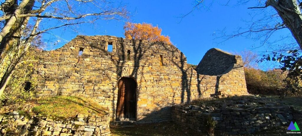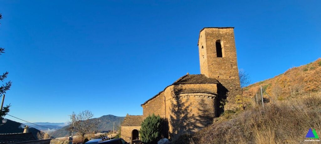 Muy cerca del pueblo, cuando llevamos solamente 0,6 km, se encuentra la ermita dedicada a santa María, perteneciente al primer mozárabe serrablés de mediados del siglo X. Actualmente en estado de ruina, es de forma rectangular, sin ábside semicircular. La limpieza del interior de la ermita donde se almacenaban todos los escombros de la cubierta derrumbada y parte de los muros dio como sorpresa un interesante suelo de canto rodado, que estaba en mal estado de conservación, pero que se restauró.