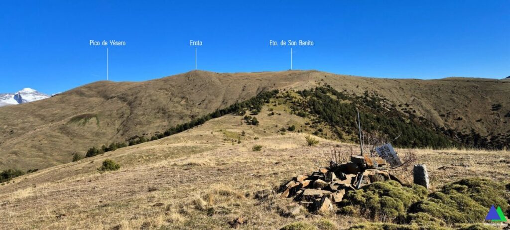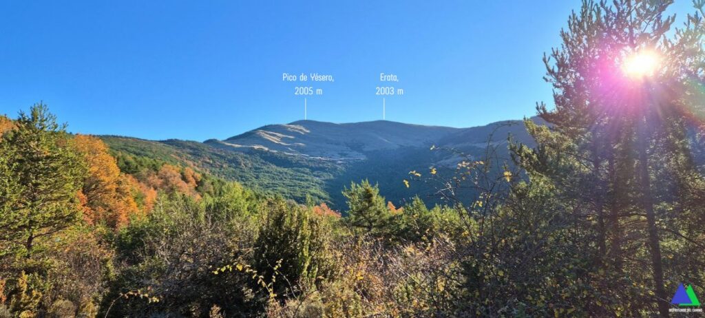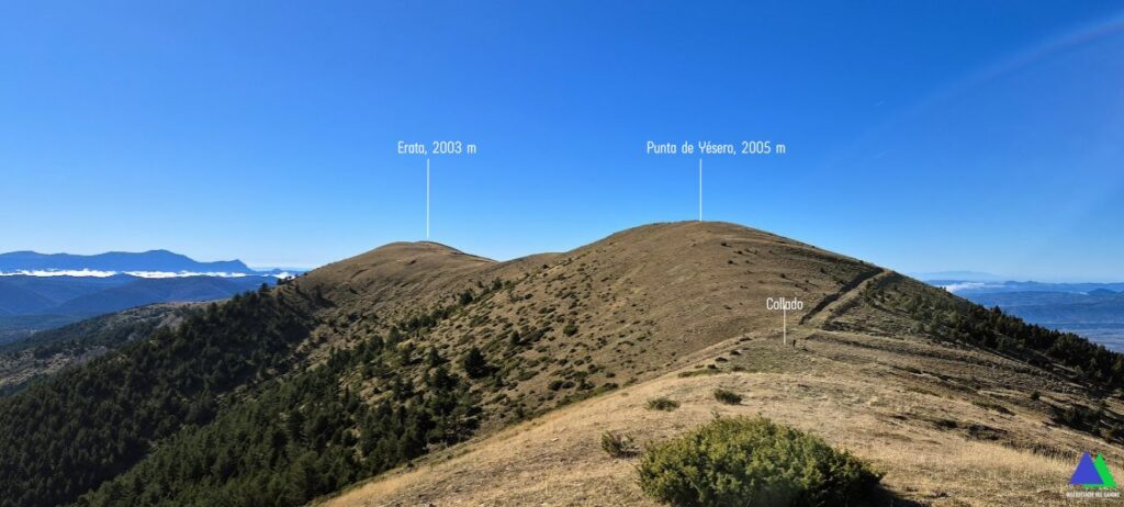 NOTA: Nosotros asignamos los nombres de cotas y altitud, según vemos en los mapas, pico de Yésero, 2005 m, señalizado en su cima de esta forma y al que algunos reconocen como Erata norte (Vemos que algunos señalan como pico Yésero, a la cota 1984 m, por la que hemos pasado). La cumbre con el vértice geodésico, se considera como el Erata (Erata sur), con 2003 m de altitud.