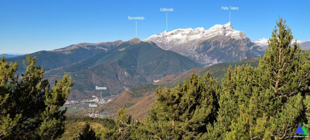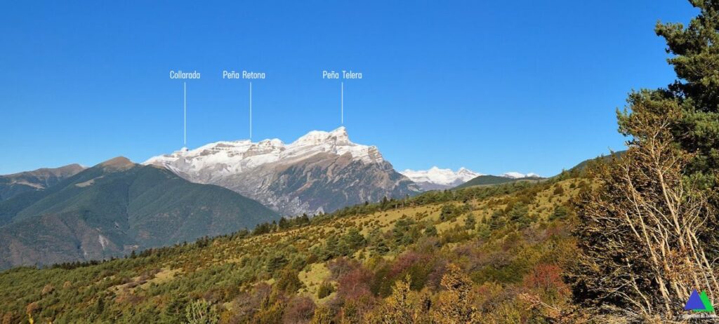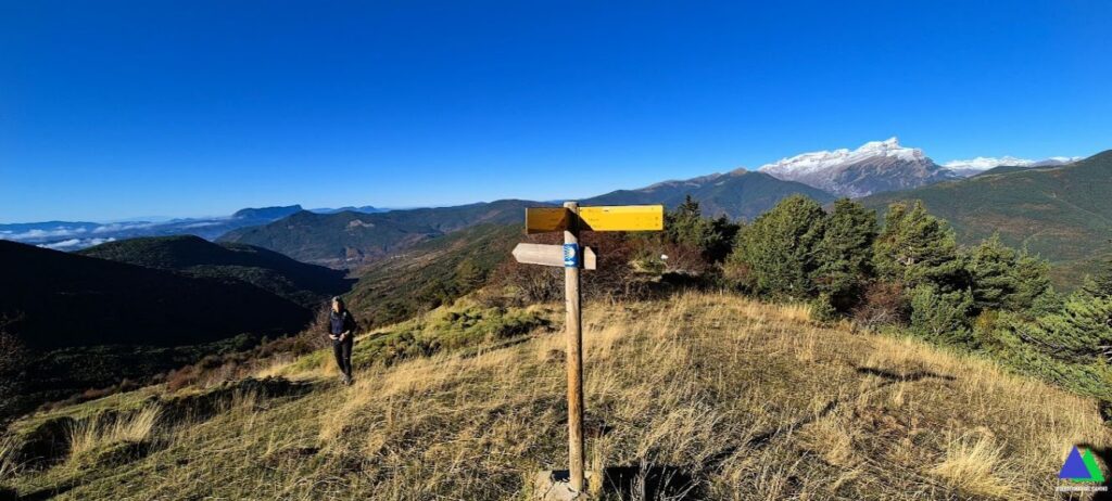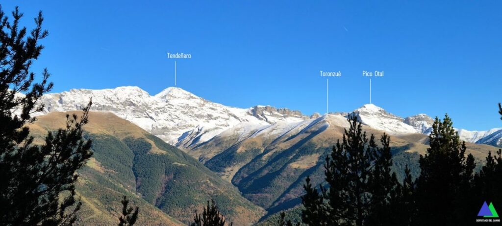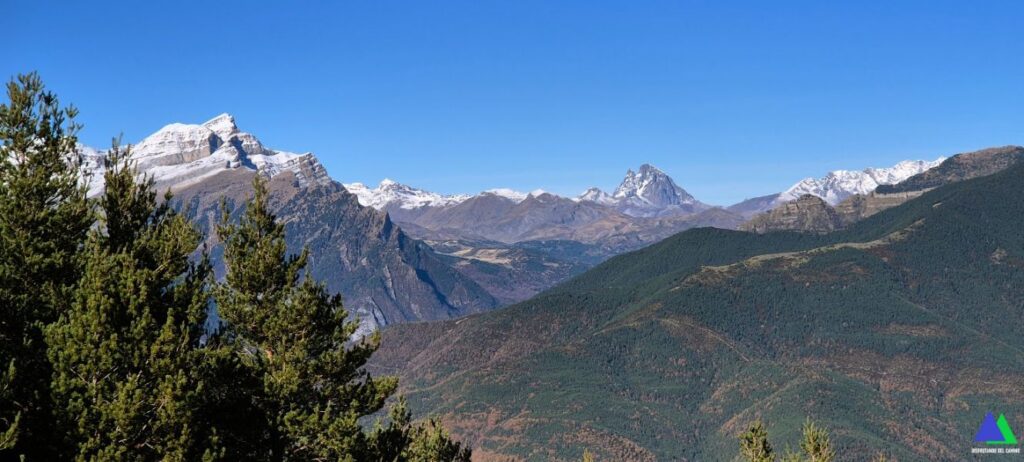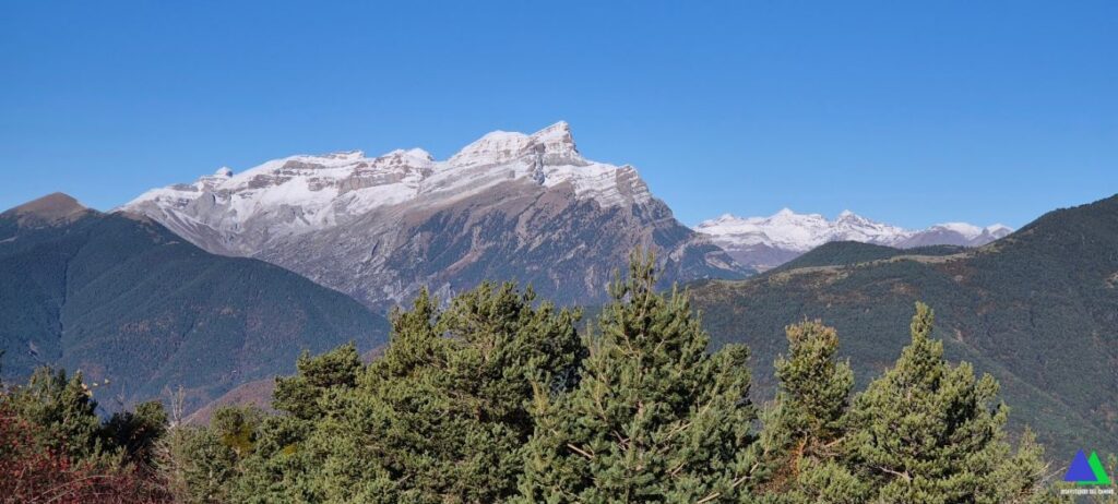 Aquí, nos unimos al GR-15 que viene de Yésero, girando a la derecha. Seguimos el sendero balizado con las señales rojiblancas, que gana altura en dirección a Broto y Otal. Muy pronto, el marcado sendero se adentra bajo los pinos realizando varias revueltas por un corto tramo del pinar, saliendo a terreno despejado donde las vistan se abren hacia la sierra de Tendeñera, Balaitus, Taillón, cuenca del Gállego y sierras exteriores.
