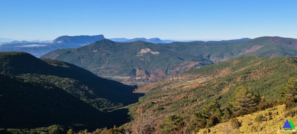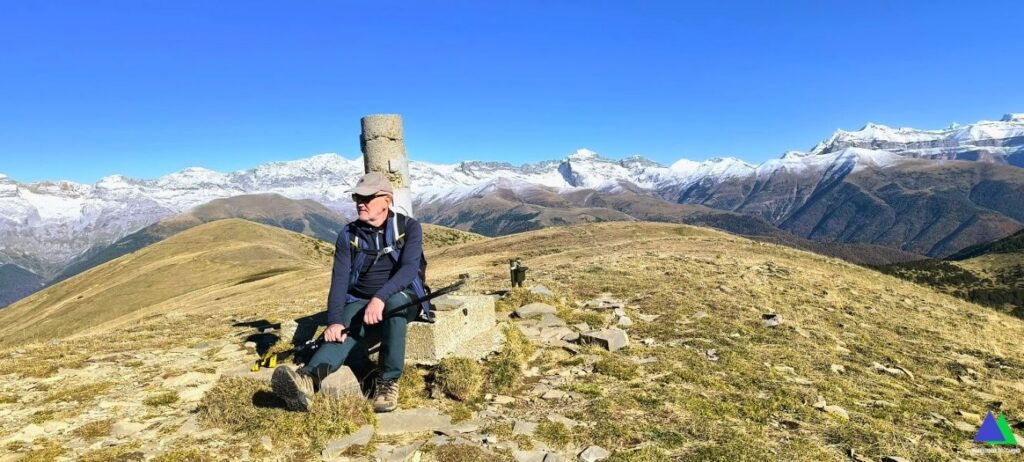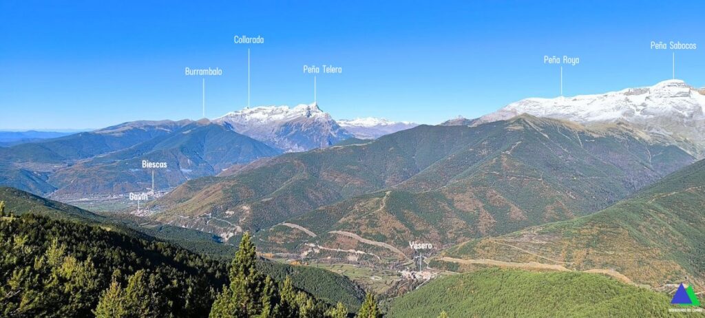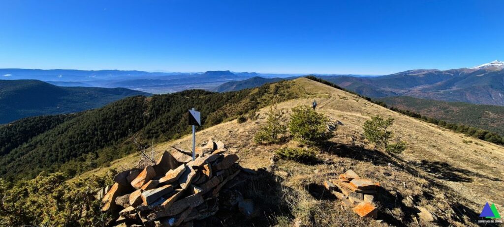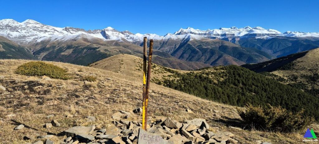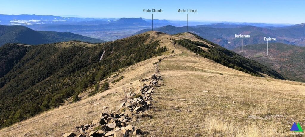 Volvemos de nuevo al collado, donde abandonamos el GR-15 y desde el que damos alcance rápidamente a nuestro primer objetivo, el pico de Yésero, 2005 m de similares panorámicas. Sin apenas desnivel coronamos el Vértice de Erata, 2003 m, en el que destaca un buzón y un vértice geodésico. Continuamos en la misma dirección por la herbosa loma, hasta llegar a la ermita erigida en honor a San Benito. Ahora cambiamos de rumbo hacia el oeste perdiendo altura por la alargada loma en la que iremos pasando sucesivamente por las cimas de Pelopín ( 1872 m ), Punta Chunda ( 1855 m ) y Monte Labayo ( 1798 m ). Desde esta cima, salvo un tramo a modo de atajo por un viejo sendero, una pista que realiza numerosas lazadas desciende entre pinos hasta el barranco d`Os Lucas. Tras atravesarlo, una pista, nos conduce hasta la carretera, de acceso a la localidad de Espierre.