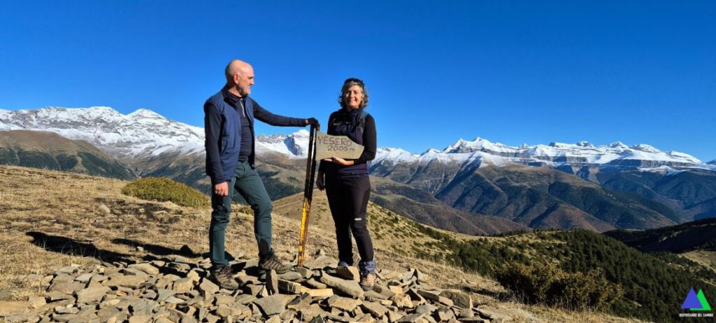 Desde el collado, 1967 m, a escasos cien metros, alcanzamos sin mayor dificultad, la pequeña prominencia herbosa (6,7 km, 1984 m), situada sobre el pueblo de Yésero, señalizada con un hito de piedras, a la que algunos le asignan el nombre de “pico Yésero”, pero que nosotros no vemos señalizada como tal, en ningún mapa. Un balcón extraordinario de espectaculares vistas, similares a las que veremos posteriormente desde el pico de Yésero y el Erata.