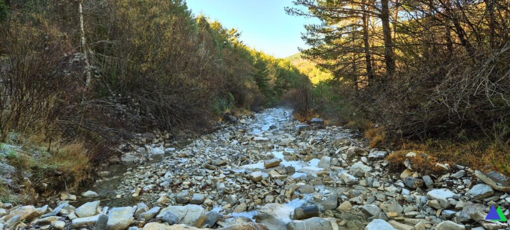 El atajo por el viejo camino acaba en la pista forestal tras descender algo más de 200 metros (15,9 km, 1145). Seguimos por ella hacia la derecha para atravesar, doscientos metros después, el barranco d`Os Lucas.