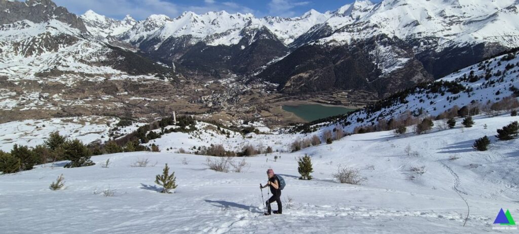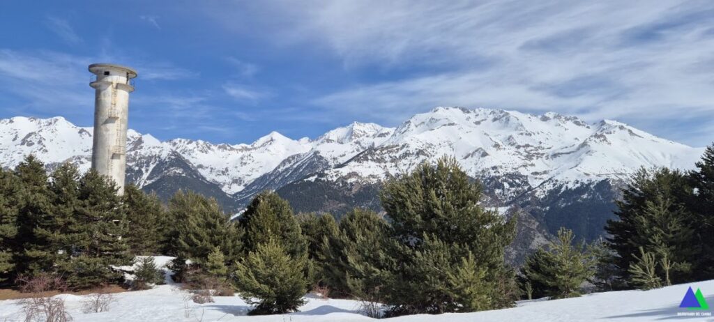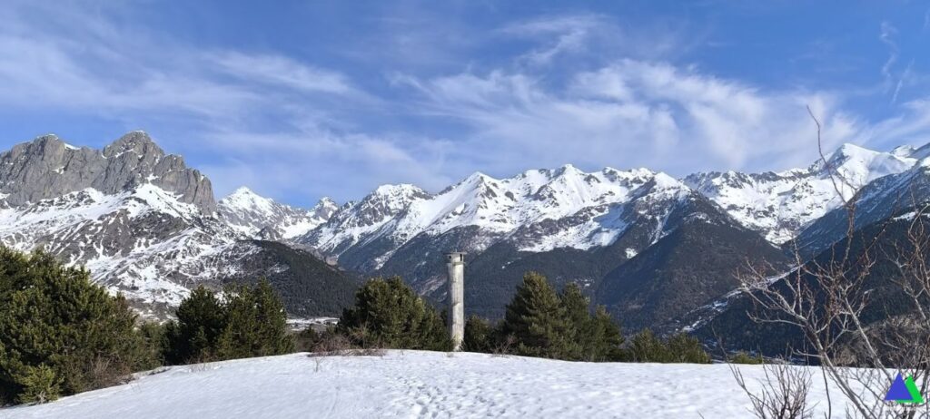 Desde el inicio con las raquetas puestas, seguimos el sendero PR HU-91 que sale del aparcamiento por la pista ascendiendo ligeramente en dirección sur, hacia Plana de la Selva (Selva de Sallent). Trescientos metros más adelante, la abandonamos, tomando un camino a mano izquierda que nos lleva a una zona abierta previa al bosque (en veranos, zona de pastos), donde enlazamos con el sendero PR HU 91, que unos metros antes ha dejado de seguir por la pista. Tras atravesar esta zona, libre de vegetación, nos adentramos en un bosque de hayas. Las vistas del entorno empiezan a ser impresionantes. El camino se transforma en un sendero que serpentea ganando altura hasta salir del bosque (1,2 km, 1600 m) a otra zona de pastos (en verano), donde nos encontrarnos con una gran torre de descompresión de aguas perteneciente a la conducción que conecta el embalse de Escarra con la estación hidroeléctrica de Sallént de Gállego. Un buen lugar para sacar unas fotos del Pacino, Formigal, Midi d`Ossau…y descansar unos minutos.
