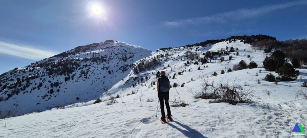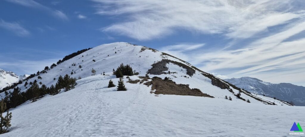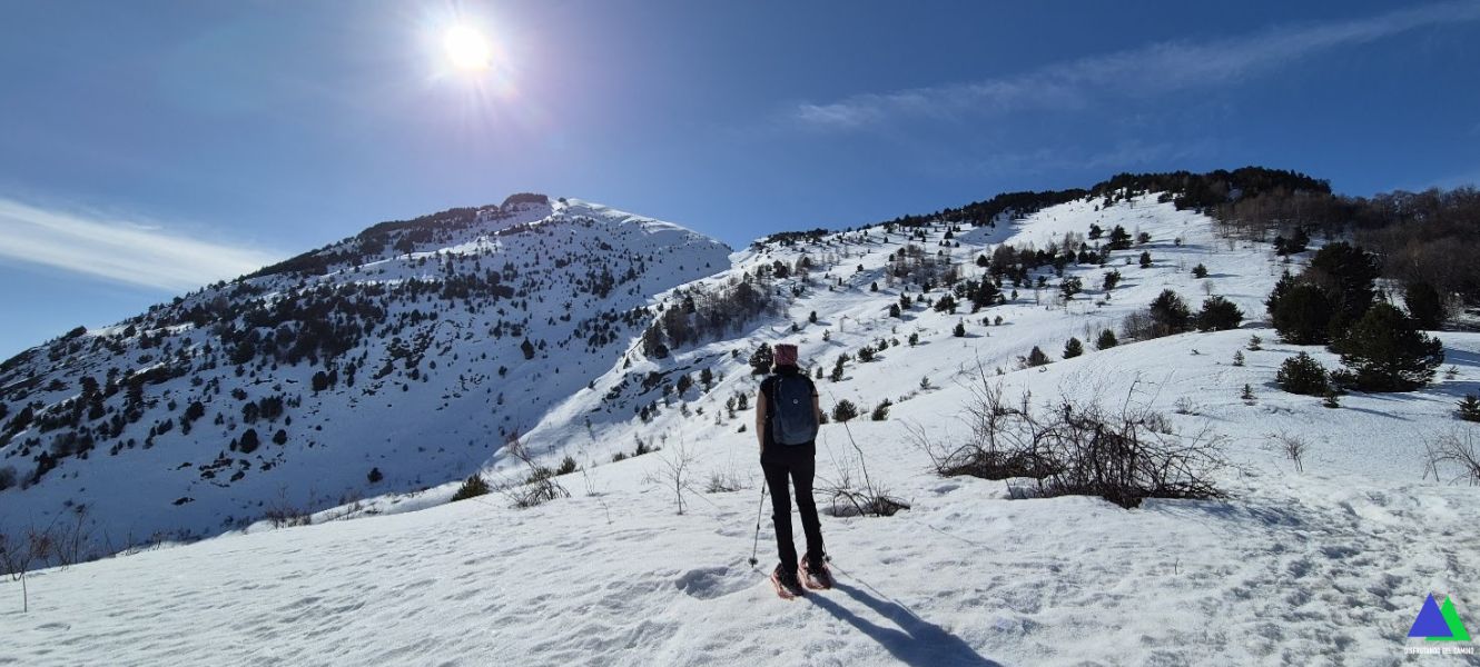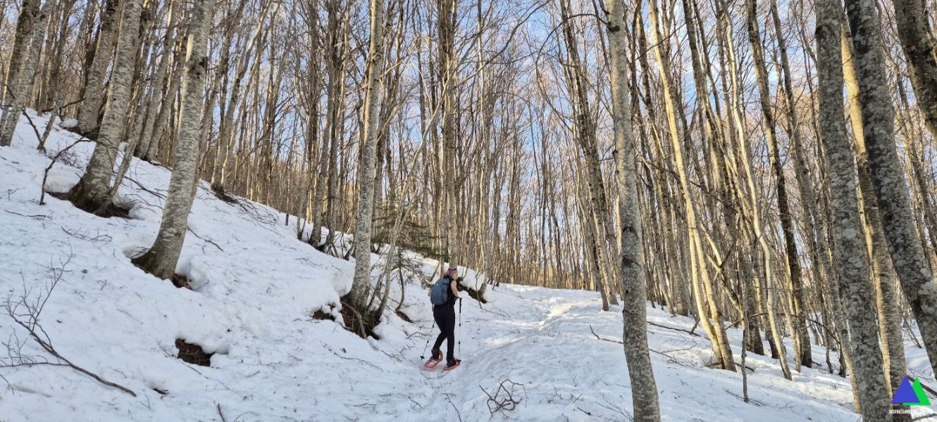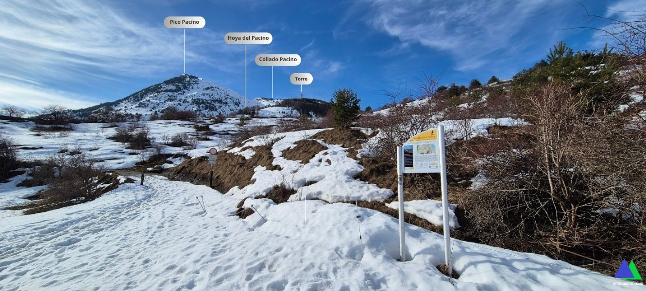 Sin nieve, esta ruta no tiene ninguna dificultad, sin embargo, cuando la nieve cubre sus laderas, cambia el decorado y dependerá de su estado. La nieve llega hasta las inmediaciones del aparcamiento Pacino, por lo que no dudamos en iniciar el recorrido con las raquetas puestas y los crampones en la mochila, por si las moscas. ¡Menos mal, porque antes de llegar al collado se pasa por tramos bastante delicados por la pendiente y nos los tuvimos que poner!. Nos faltaba el piolet, que no lo llevábamos por error logístico (el binomio piolet-crampón es indivisible)