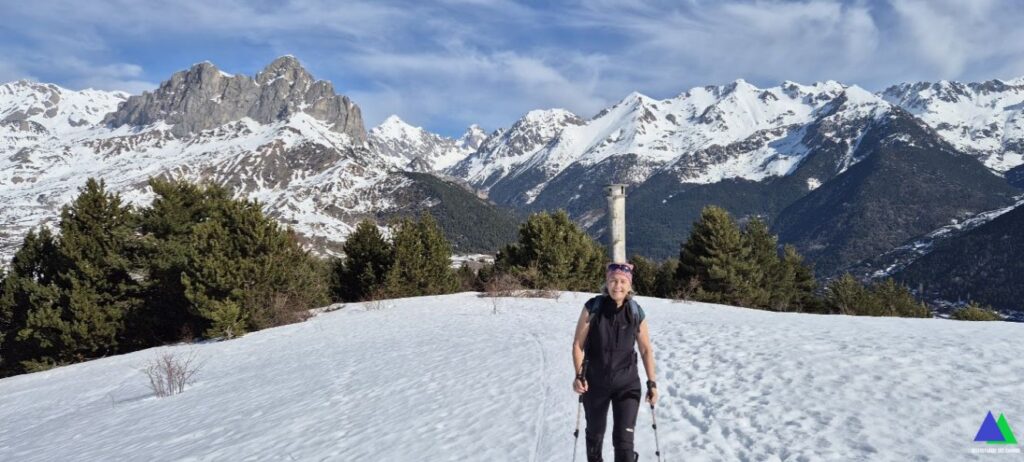 Desde aquí, procuramos seguir las huellas de raquetas y crampones dejadas en días anteriores y que aproximadamente siguen el trazado del PR. Pronto las condiciones de la nieve, requieren que nos pongamos los crampones con los que ya, con mayor seguridad, alcanzamos el collado Pacino, sin problemas y disfrutamos de las magníficas panorámicas del Pirineo nevado. Volvemos al punto de partida, desandando el camino.