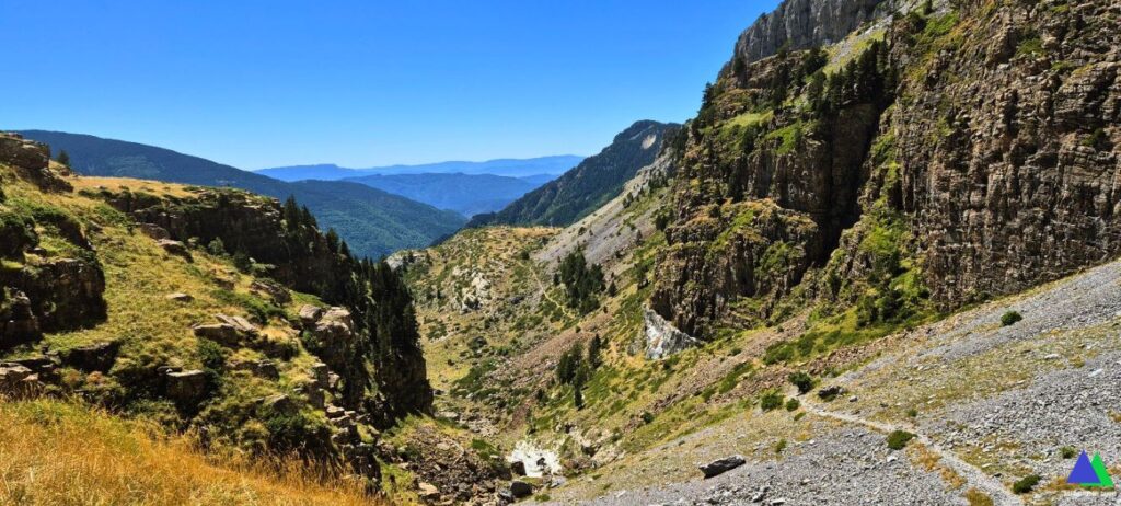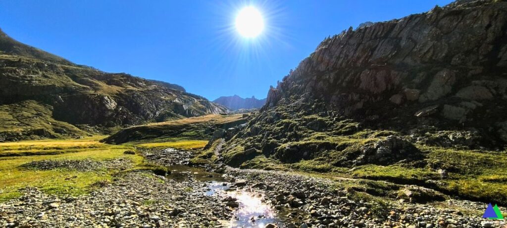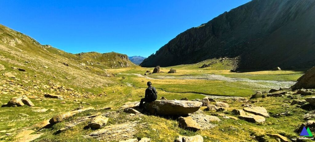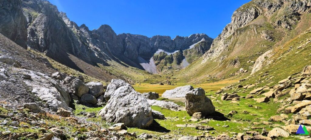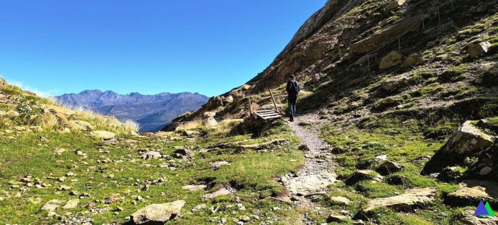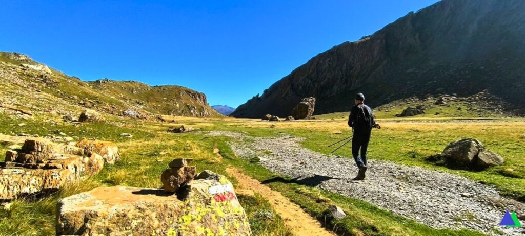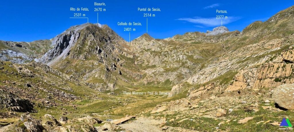 Quizás este GR no pase en su largo recorrido y en un tramo tan corto, por tan bellos lugares. Un sendero que discurre por un desfiladero entre los macizos del Bisaurín y el de Bernera, atraviesa por las bucólicas Planas de Mistresa y el Valle de los Sarrios y nos lleva hasta el ibón de Estanés, un remanso de paz, escondido hasta el último instante.