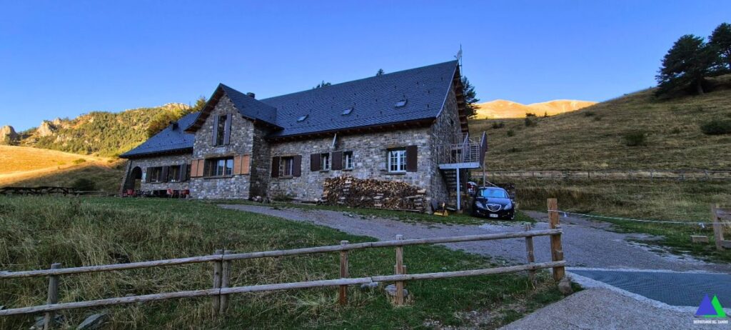 Nuestra excursión comienza también desde este amplio aparcamiento junto al refugio de Lizara, siguiendo las marcas del GR-11, que bordean el edificio.