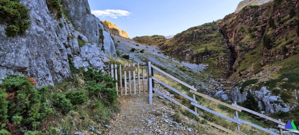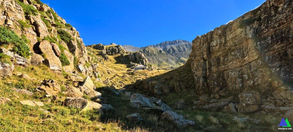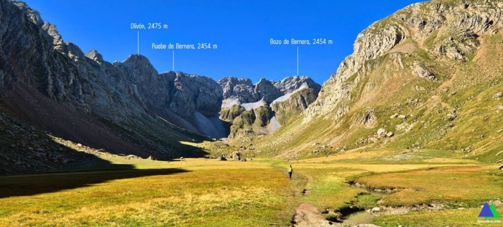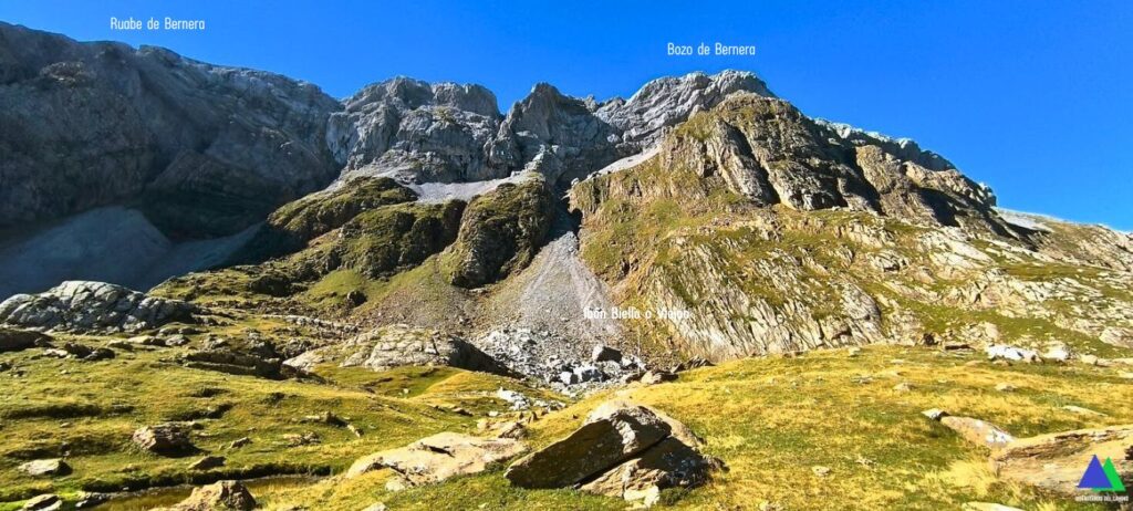 Llegamos al puerto de Bernera (5,3 Km, 2.115 m), punto más alto del recorrido y puerta de entrada al valle de los Sarrios, que se extiende hacia el noreste. El sendero desciende por la vertiente opuesta por terreno herboso y de canchal. Recorrer este espectacular valle glaciar, encajonado en un entorno impresionante hasta su entrada, nos llevará poco más de veinte minutos. Un poquito antes de llegar, a la derecha, se puede hacer una visita al pequeño Ibón Biello o Ibón Viejo, oculto tras una morrena.
