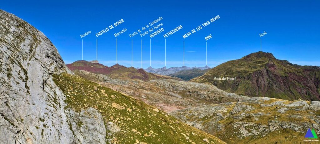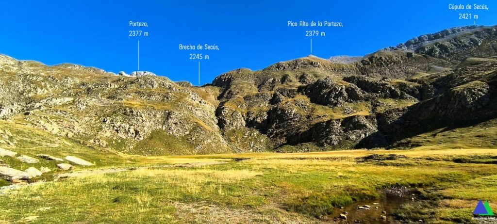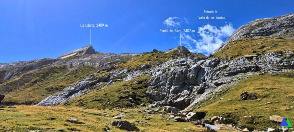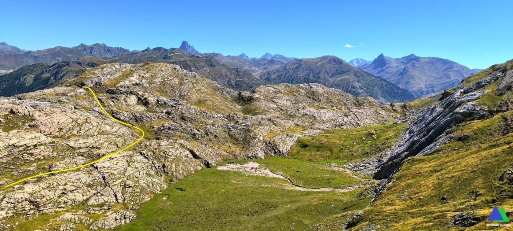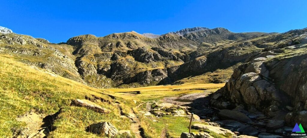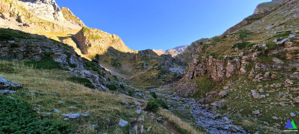 Desde el plano del pequeño valle, antes de ascender hacia el valle de los Sarrios, nace un sendero (línea amarilla foto) que desemboca en el puerto de Escalar o de Estanés, 1792 m, collado que se alcanza antes de bajar al Ibón de Estanés en la ruta desde Sansanet.