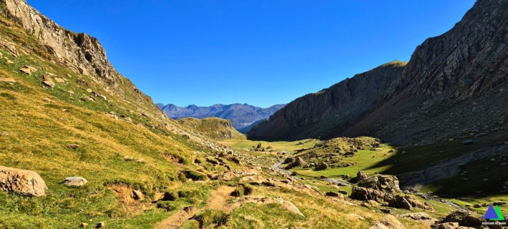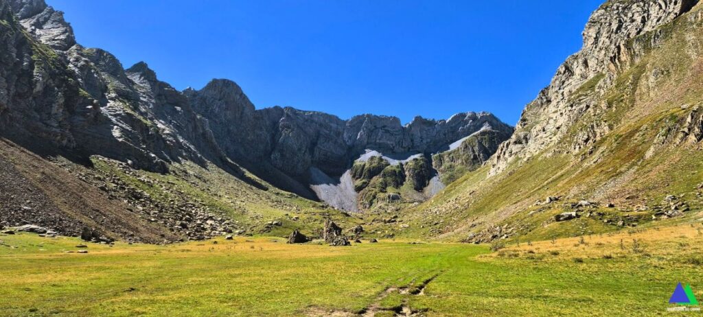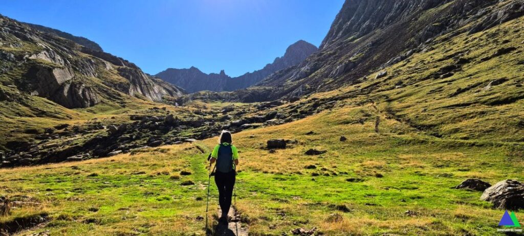En este punto el camino gira al este y deja atrás esta ancha paúl, para ascender al Puerto de Bernera, 2115 m, que es la puerta de entrada al Valle de los Sarrios, al que se desciende en unos minutos más. Para continuar al Ibón de Estanés, hay que recorrer este valle hacia el norte, hasta su entrada. En la margen derecha salir del mismo por una estrecha canal que rápidamente pierde cota y enlaza con el fondo de otro valle plano. A continuación, el GR gira al oeste y atraviesa unos pastizales hasta flanquear sobre el lago. Finalmente descender hasta el Ibón d’Estanés, 1777 m o hasta sus inmediaciones, donde ya es visible. El regreso se realizará siguiendo el mismo itinerario.