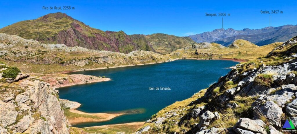 Por la derecha, descendemos hasta las inmediaciones del Ibón d`Estanes, escondido hasta el último momento. Desde lo alto de un montículo, lo vemos, disfrutando como siempre de este bello lugar. (8,1 km, 1836 m). Detrás nuestro, la sierra de Secús, es testigo de la soledad de sus aguas, de este paraíso al que se puede acceder por distintos valles.