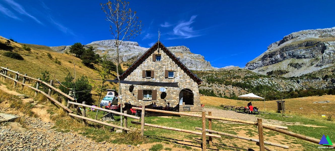 Nuestra excursión comienza también desde este amplio aparcamiento junto al refugio de Lizara, siguiendo las marcas del GR-11, que bordean el edificio.